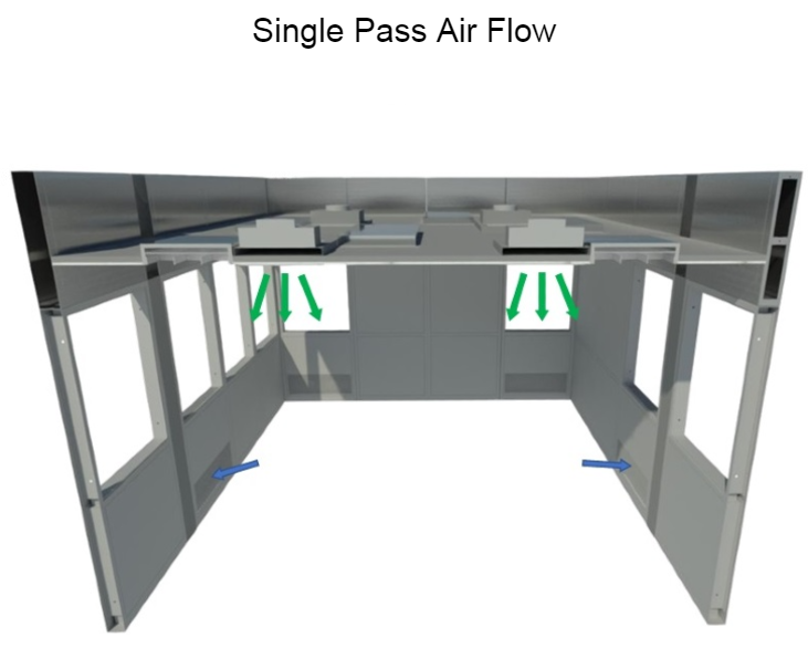 The Single-Pass Airflow Clean Room filters ambient air once through ceiling HEPA units before immediately exhausting the air completely out of the space. This design is simple and cost-effective but offers limited control over internal temperature and humidity, as the environment directly relies on the external facility air quality.